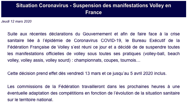 Suite aux récentes déclarations du Gouvernement, la Fédération Française de Volley a décidé de suspendre l'ensemble des manifestations officielles de volley : championnats, coupes, tournois… jusqu'au 5 avril pour le moment.
